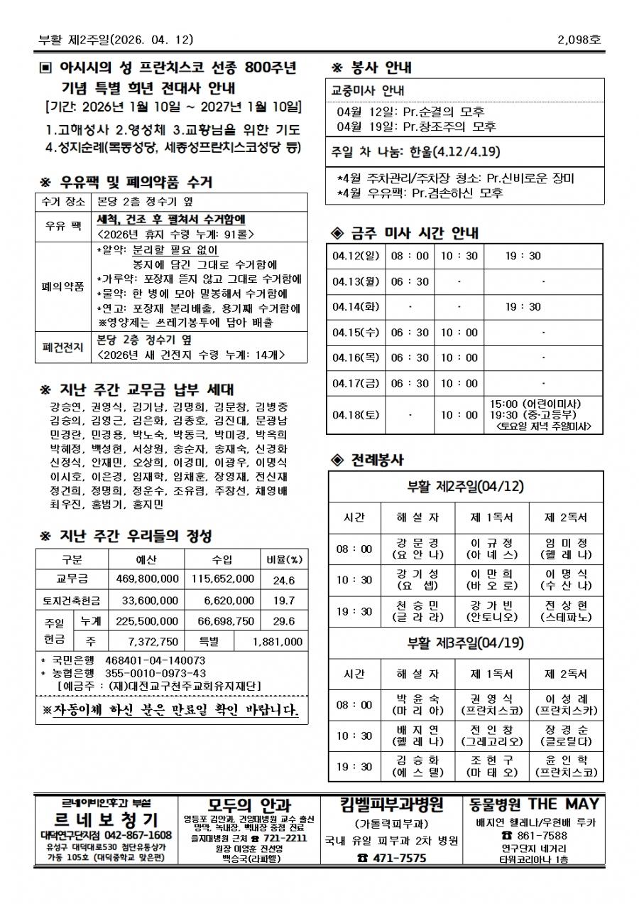 부활 제2주일 곧, 하느님의 자비주일(2098,20260412)